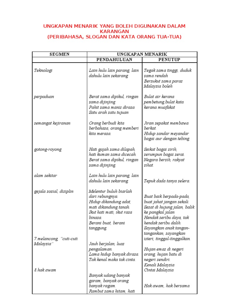 Ungkapan menarik karangan 1. KARANGAN PERIBAHASA SLOGAN DAN KATA ORANG TUA-TUA. Pandu cermat jiwa selamat.